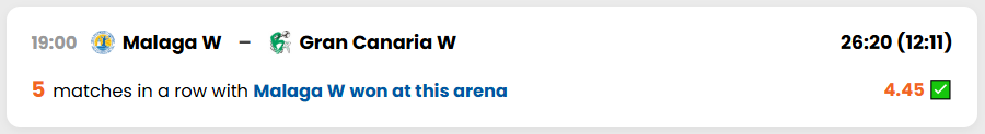 On February 14th, 2026 in the Division de Honor Women, we trusted the arena factor. Malaga W had already won five matches in a row at this venue, and history repeated itself in dominant fashion. Final score 26:20 after a tight 12:11 halftime.