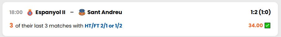 Lors d’un affrontement passionnant en Segunda División RFEF – Groupe 3, notre prédiction pour le match entre Espanyol II et Sant Andreu s’est révélée exacte, le score final de 1:2 correspondant à notre analyse. Les cotes de 34.00 ont mis en avant la valeur potentielle de cette rencontre, surtout en tenant compte que trois des trois derniers matchs des deux équipes ont présenté un résultat de mi-temps/temps plein de 2/1 ou 1/2.