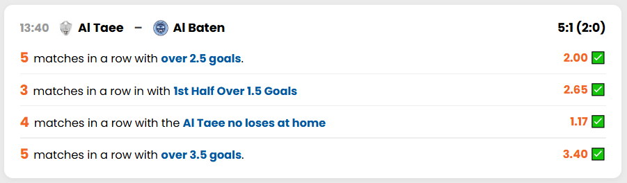 Al Taee i Al Baten odigrali su meč koji je završen rezultatom 5:1, uz potpunu kontrolu već na poluvremenu. Analiza je jasno ukazivala na golove, a kvota 3.40 donela odličnu vrednost.